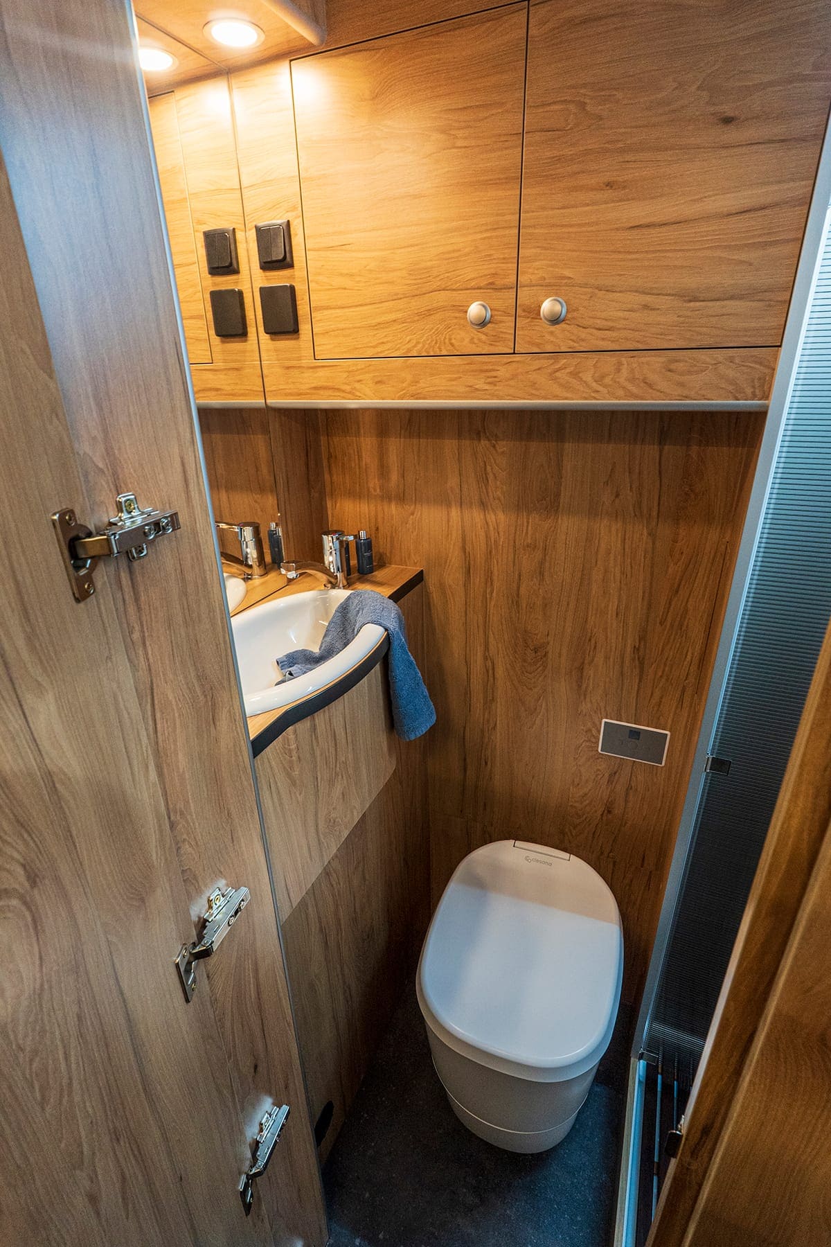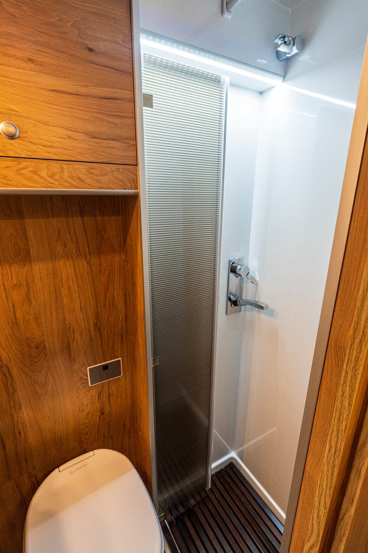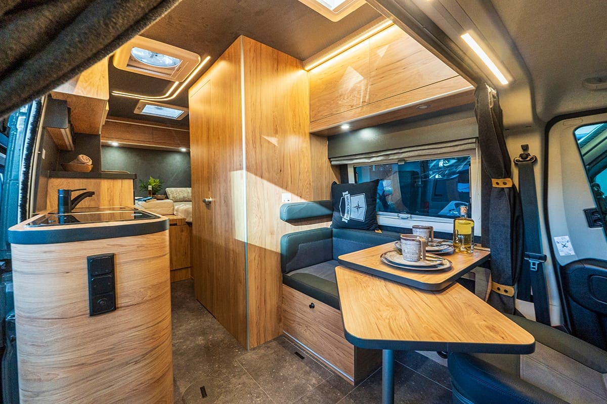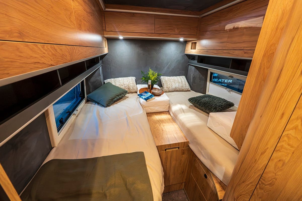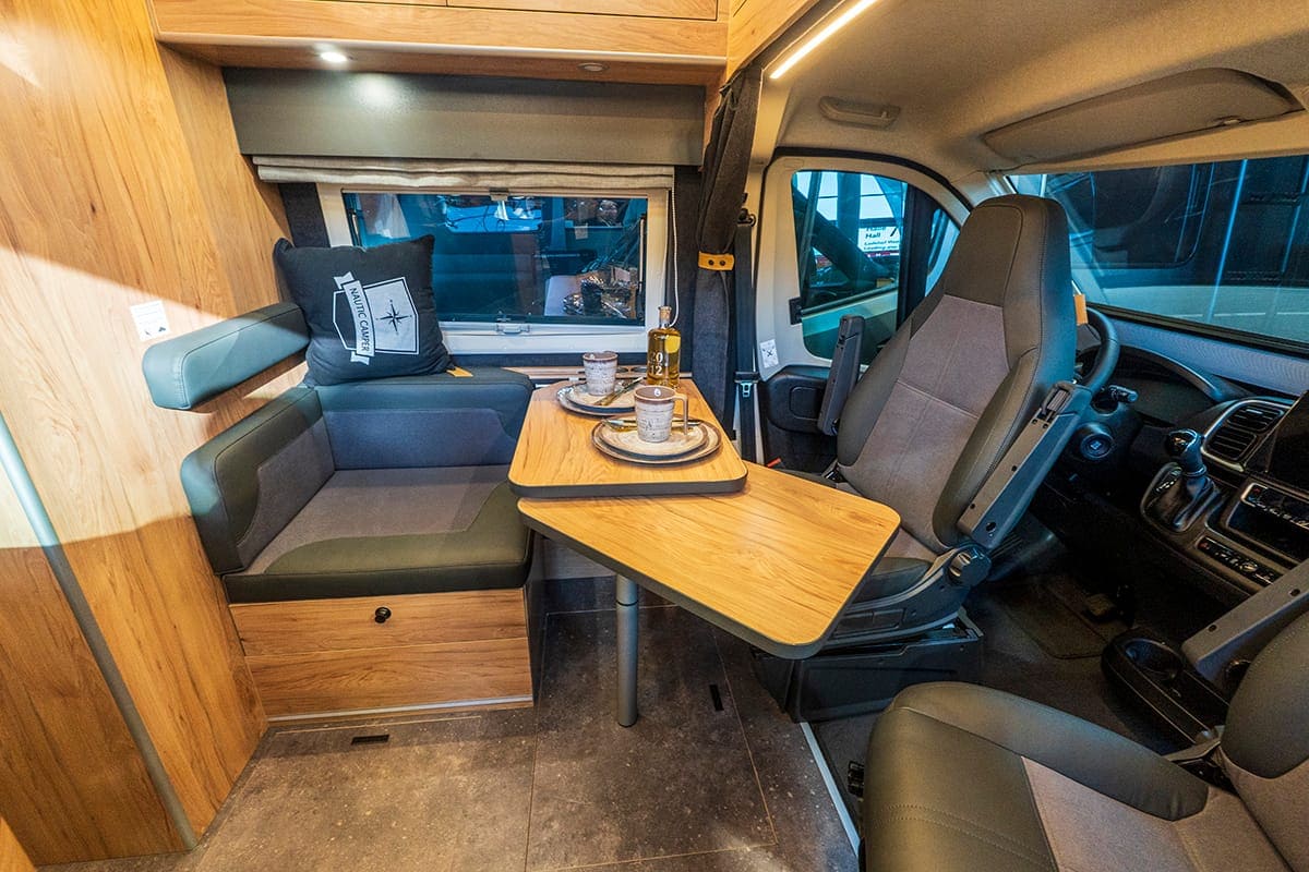 Nu var det varken bilens pÄkostade hantverk eller bagageluckan som gjorde att jag dröjde mig kvar vid denna modell. Det som fÄngade min uppmÀrksamhet var de lÄga lÄngbÀddarna, badrummet med separat duschkabin och dinetten med ensitsig hörnsoffa.