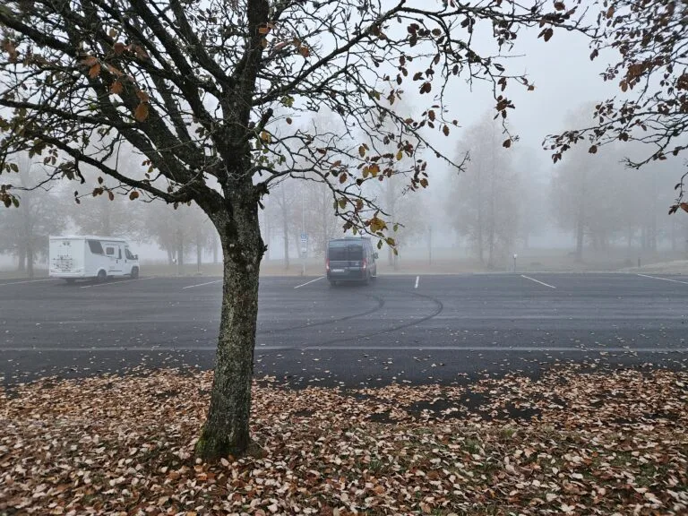 Det är dimmigt och det har börjar mörkna så vi gör ett stopp i Filipstad över natten och svänger in på den nyöppnade ställplatsen Läs