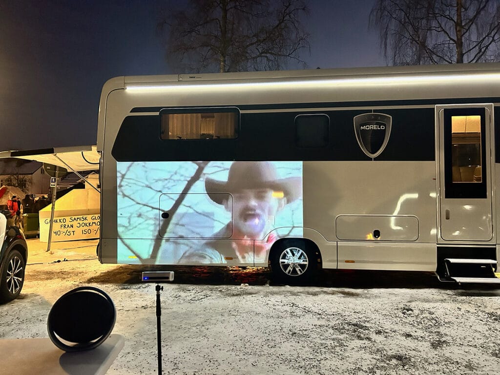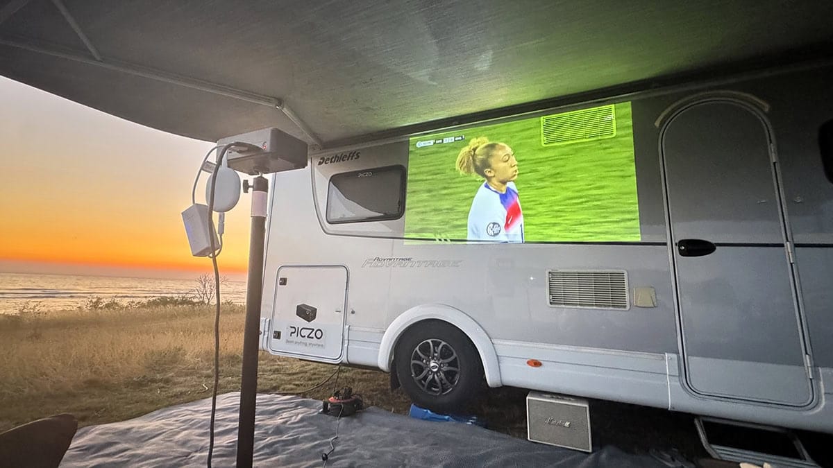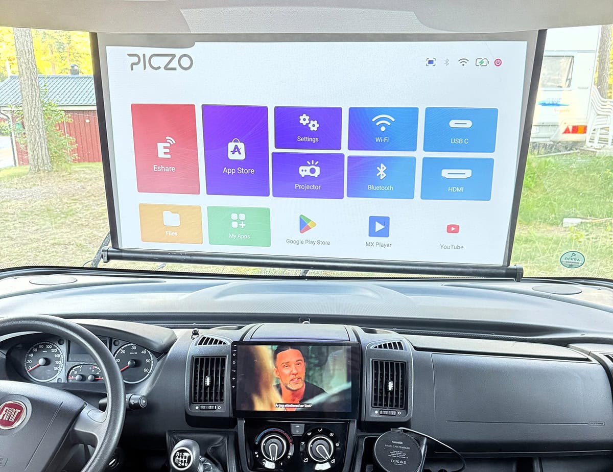 En liten projektor som tar minimal plats, men ger stor bild inne i husbilen. Till och med så stor bild att man kan använda husbilens utsida som ”duk”. Det är vintertid kanske inte väder här i Sverige för utesittning, men om man är i södra Europa kan det funka.