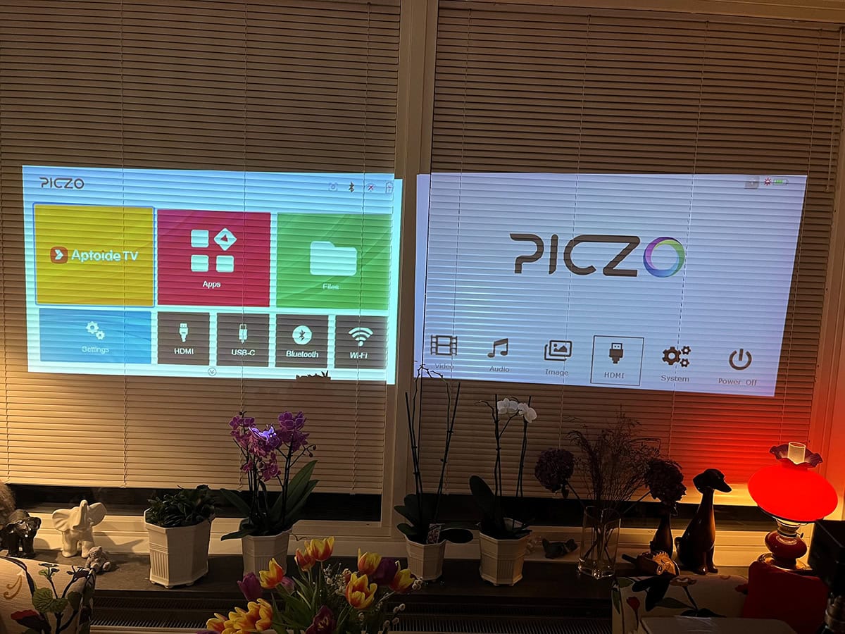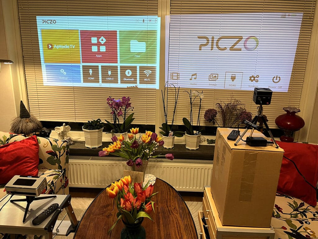Nova Pro från Piczo är en något större, fortfarande liten, projektor med väsentligt högre ljusstyrka än den jag använt tidigare. Jag testade den denna gång hemma i bostaden eftersom vädret var lite för ruggigt för ett test utomhus.  Den till vänster är den nyare versionen. Det är den vi använt oss av det senaste året vid de olika föredrag vi håller hos husbilshandlare och husbilsklubbar. Som användare av projektorn kan jag amatörmässigt berätta att den är mycket lättanvänd, har en modern smartphones alla finesser med appar och den har autofokus.