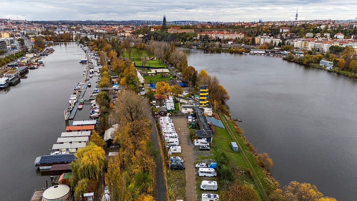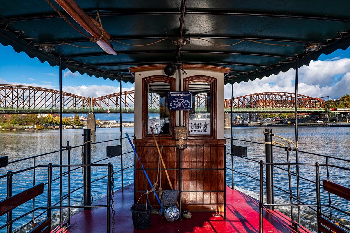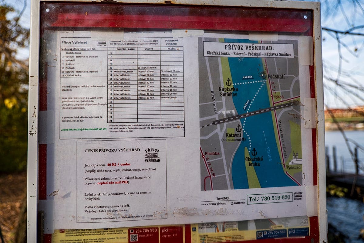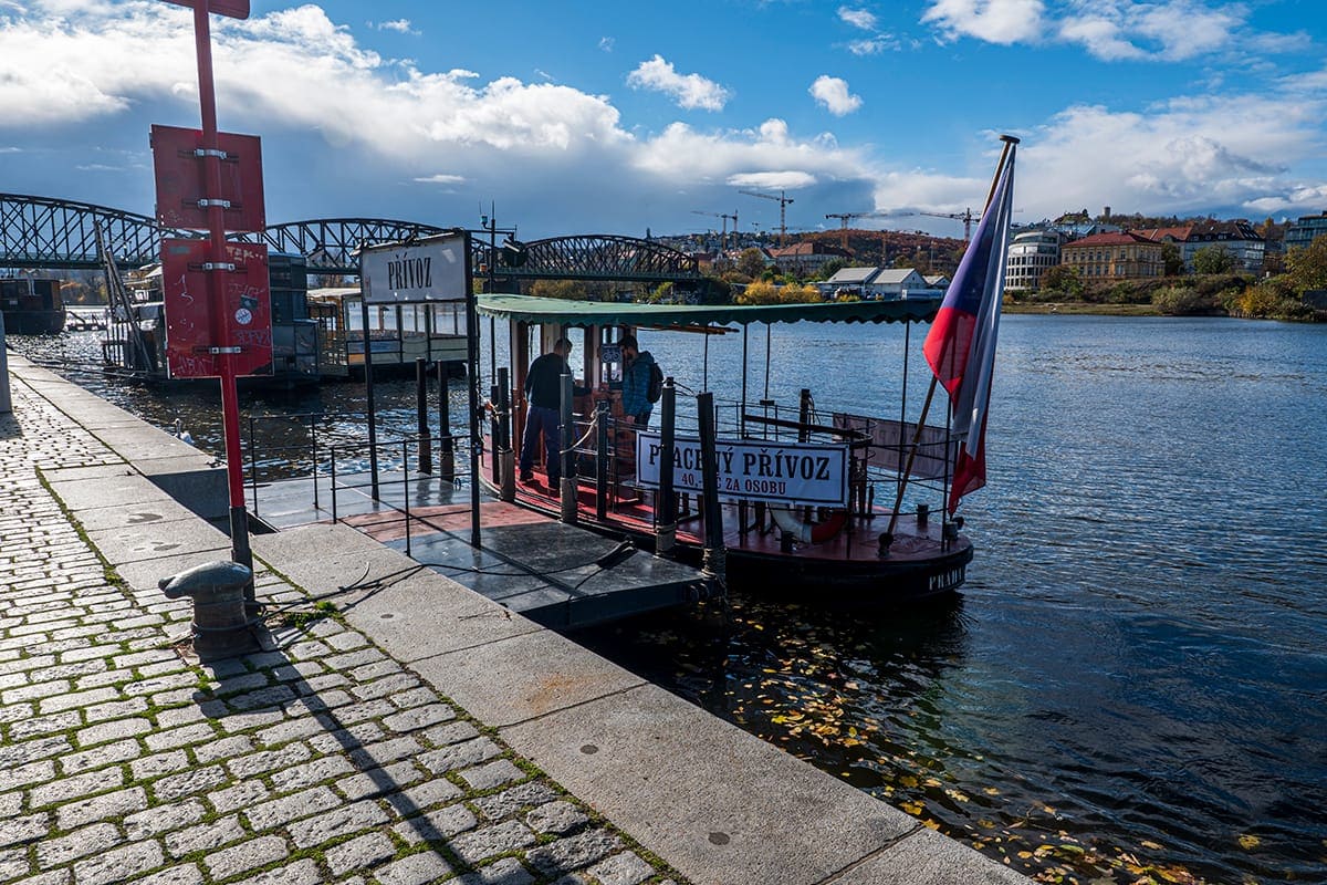 Det tar 10-15 minuter att gå till båten från ställplatsen. Båten tar knappa 10 minuter till sin lilla flytbrygga på andra sidan. Så på en knapp halvtimme har jag förflyttat mig från ställplatsen till Prags strandpromenad. Inte illa.