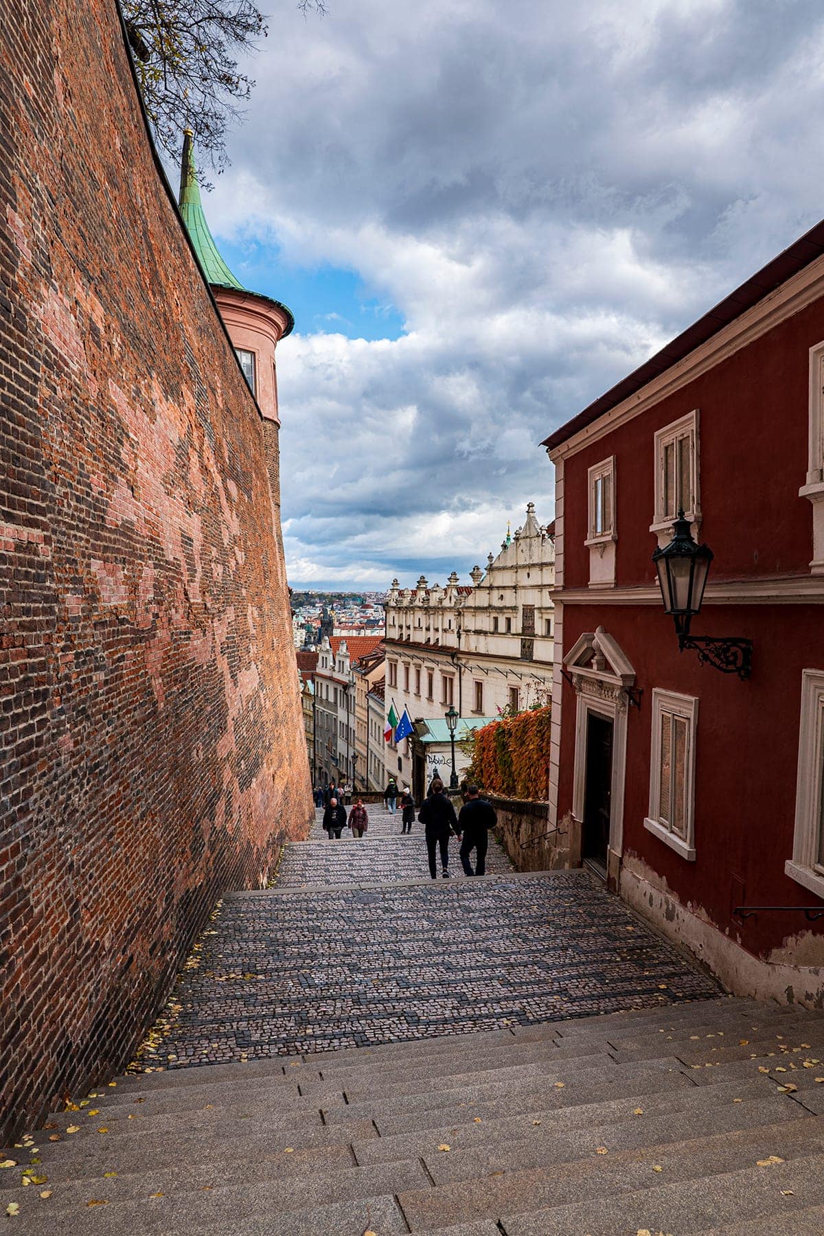På en höjd ovanför gamla stan ligger Pragborgen. Man tar sig dit genom att först gå uppför backen från Karlsbron till en lång trappa. Visserligen en trappa med bekväma steg. Men det är många steg. Tur man har kameran med sig så man kan stanna och ta en bild, inte för att hämta andan, nej nej nej, för att man är en fotograf med öga för vinklar och vyer.