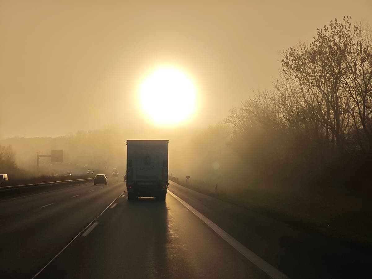 Från Dresden tar jag A4 västerut. Ibland är motorvägsåkande magiskt vackert. Det är en disig dag. Vissa sträckor är sikten så dålig att känslan är att man åker genom ett moln som trillat från himlen. Detta i kombination med en lågt stående sol skapar ett ljus som känns overkligt. Förutom att det är vackert att se på drar dimman ner farten. De fyra planerade timmarna passeras och det skymmer. Magen kurrar. Kort sagt är det dags att ta en paus. Rastplatsen jag svänger in på är stor. Så pass stor att jag kan stå långt från tradarnas elverk. Blir att jag stannar över natten.