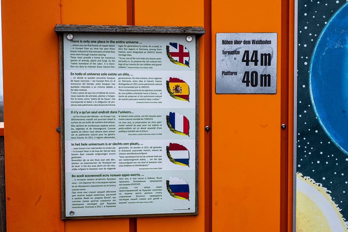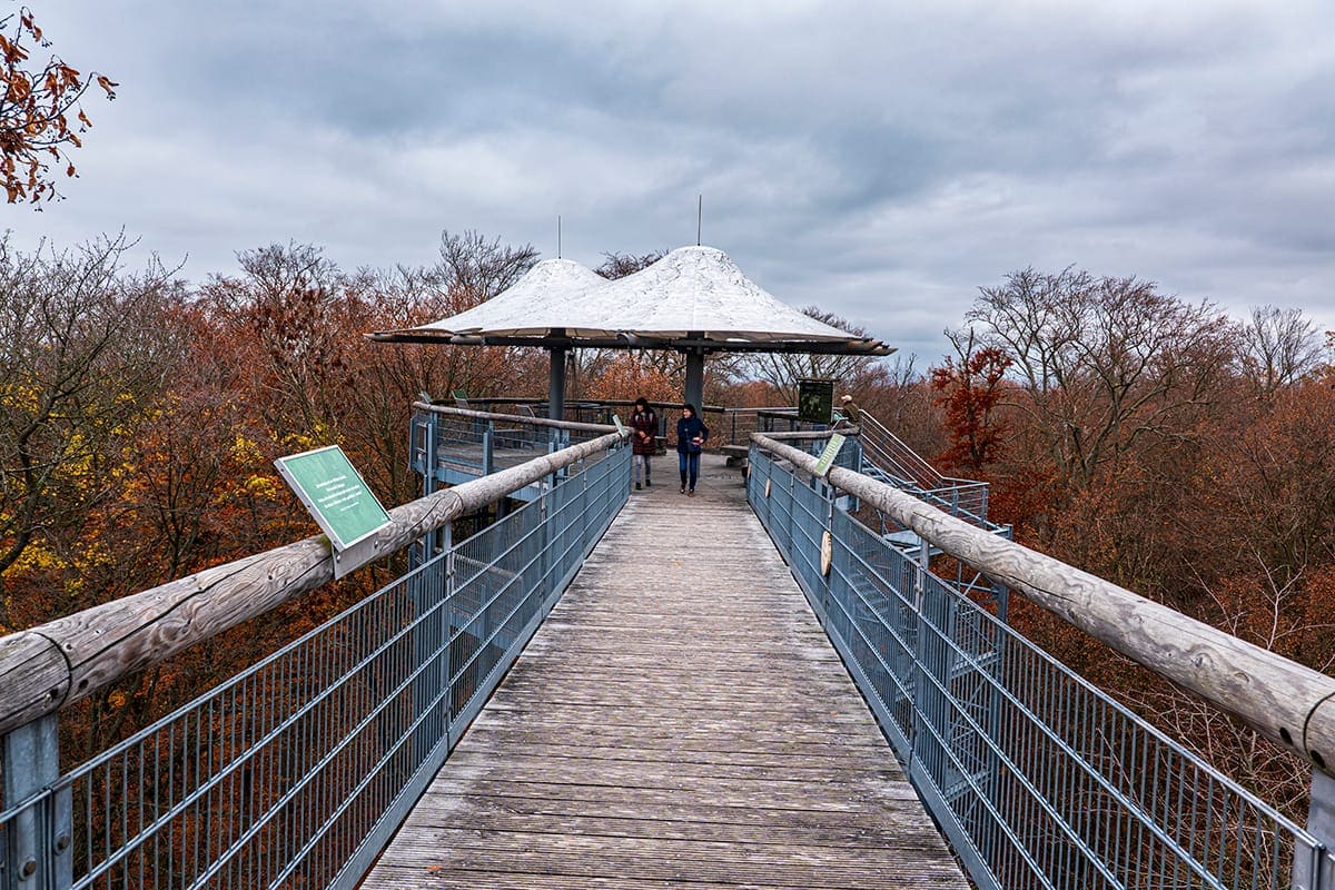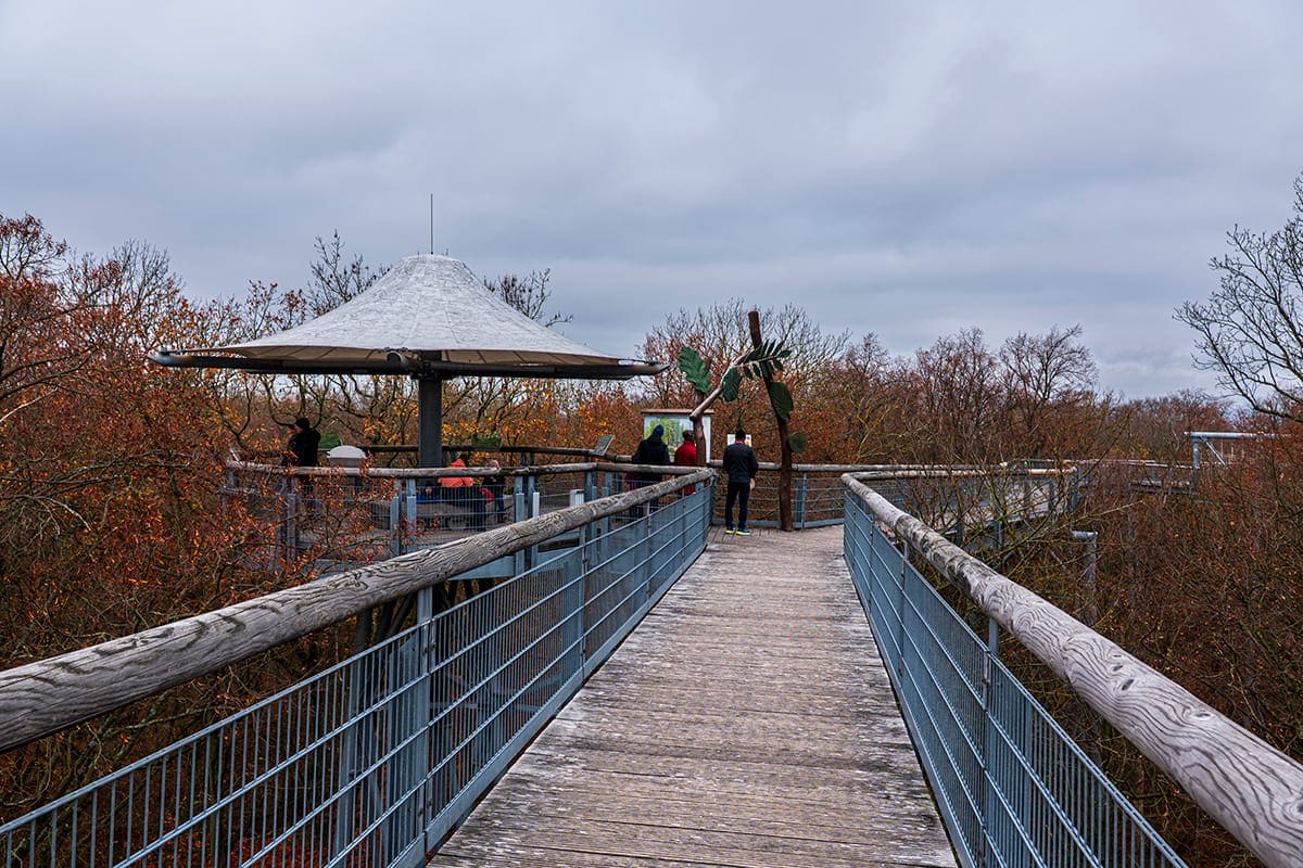 Från besökscentret är det 500 meter till trätoppsstigen. Vägen dit kantas av information om träd och skog. Man har byggt ”fönster” som man kan titta genom för att fokusera blicken på ett mindre område. Jag är inte ensam besökare. På parkeringen står ett femtiotal personbilar, några husbilar och ett par turistbussar. Det kostar €6 för en dagsparkering med husbil. Huruvida man kan stå över natten framgår inte. Men troligen. Det var några husbilar som stod en bit bort på parkeringen. Jag åkte dock vidare efter avslutad promenad.
