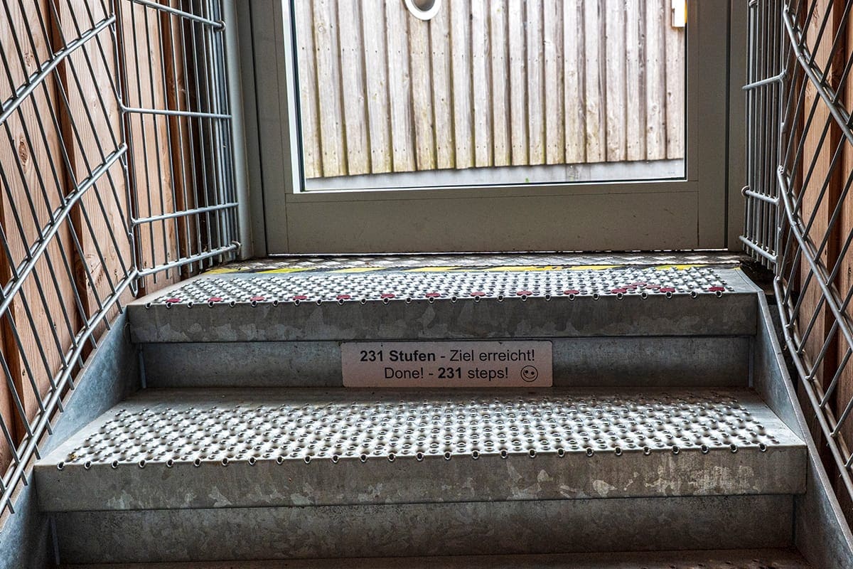 Man kan välja mellan hiss eller spiraltrappa för att ta sig upp på promenaden. Spiraltrappan kan verka avskräckande. Det är 231 steg till toppen. Men upp till starten av promenaden är det inte särskilt högt. Så om du inte har stora problem med trappor är det inget problem att ta trappan. Personligen tyckte jag det var lite obehagligt att gå i trappan närmare tornets topp. Men det har med höjden att göra. Väl uppe i tornet var höjden inget problem.