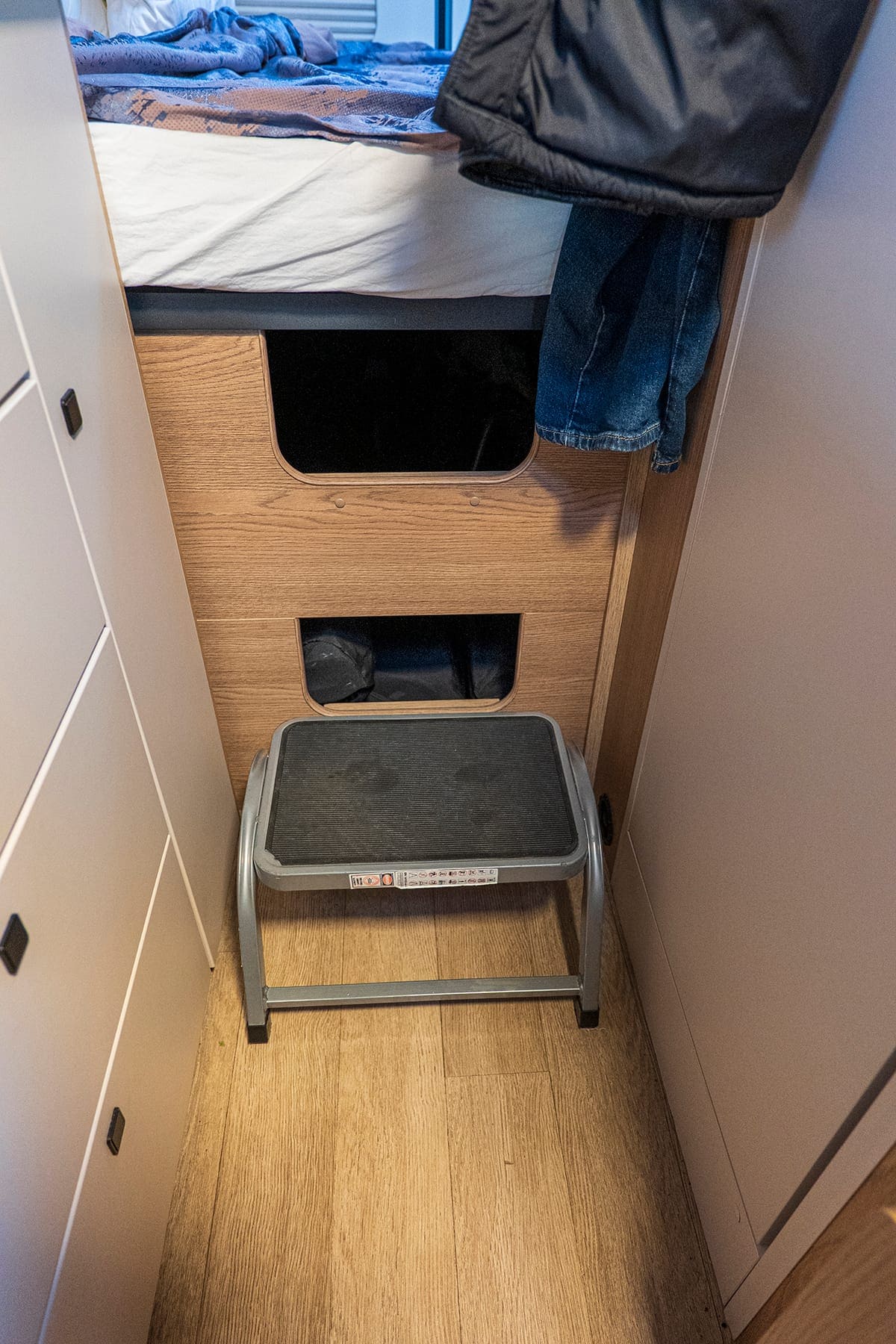 De steg Hobby tagit ut i skiljevÀggen till garaget Àr inget för mig. De kunde gott haft ett nedfÀllbart steg istÀllet. Eller att man kunde dra fram ett steg ur den nedre delen av skiljevÀggen eller garderoben. Jag valde att anvÀnda ett löst steg. Som visserligen Àr i vÀgen nÀr man ska in i badrummet eller gardoben. Men hellre det.