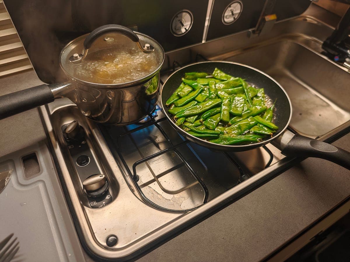 Det Àr lite trÄngt pÄ spisen. Jag har minsta möjliga stekpanna och kastrull. Det funkar, men med tanke pÄ kökets storlek hade man kunnat haft en spis med mer separation av brÀnnarna. Plus dock för att om det kokar över rinner det ner i diskhon.