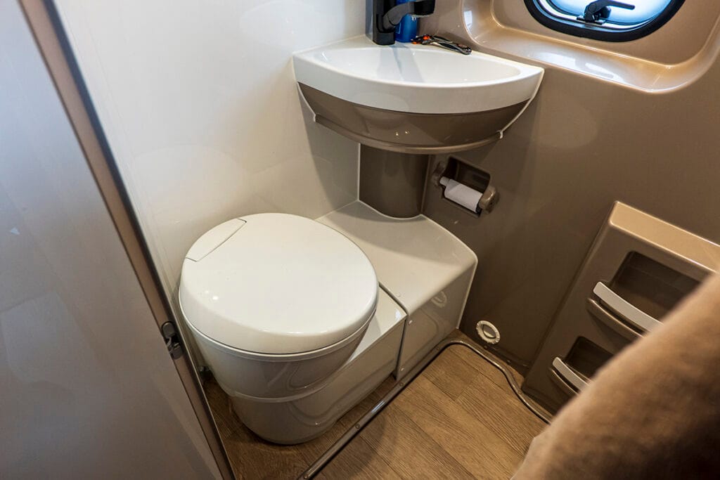 Badrummet Àr riktigt rymligt. Plastigt förvisso, men det gör inte funktionen sÀmre. NÀr man ska duscha tar man bort trÀskivan som tÀcker duschkaret. Hobby kunde nöjt sig med duschkaret. Men dÄ fÄr man en obekvÀmt hög toalett. Detta Àr en utmÀrkt lösning.