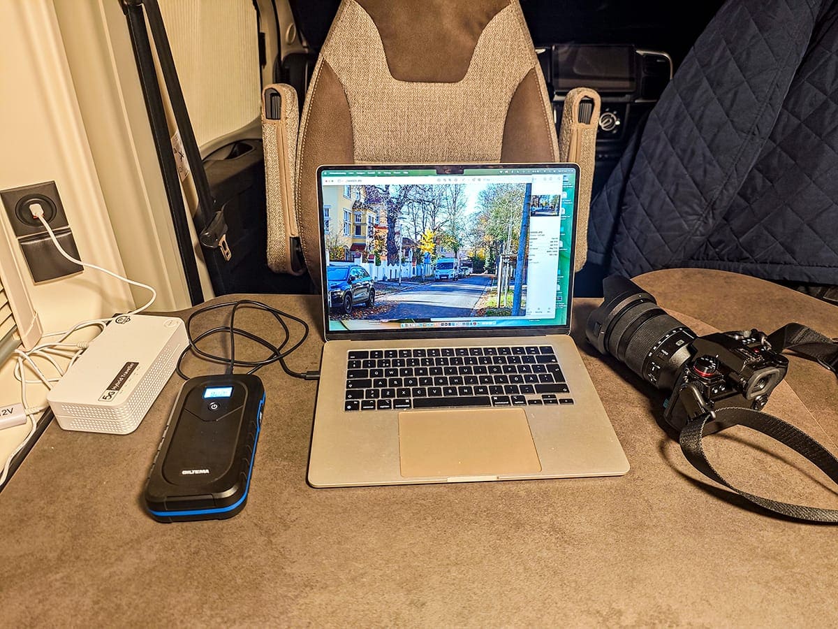 En hyggligt stor powerbank gör stor nytta nÀr man vill spara ström. Den hÄller datorn igÄng i mÄnga timmar om man sÀnker skÀrmens ljusstyrka.
