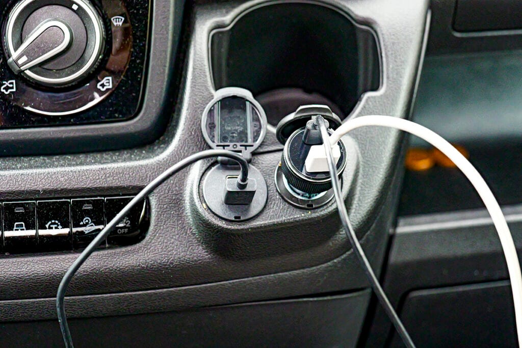 Jag ser till att ladda under fÀrd. Bilens USB-A och USB-C rÀcker inte, sÄ en extra USB laddare till cigguttaget gör god tjÀnst. Denna följde med routern och ger bra med krÀm. Betydligt mer Àn de i bodelen.