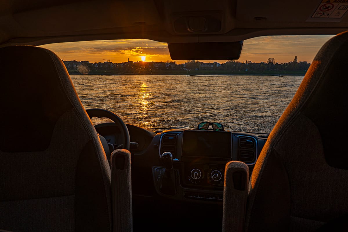 SÄ hÀr ser det ut inifrÄn husbilen nÀr solen gÄr ner över Rhenfloden. LÀtt att trivas.