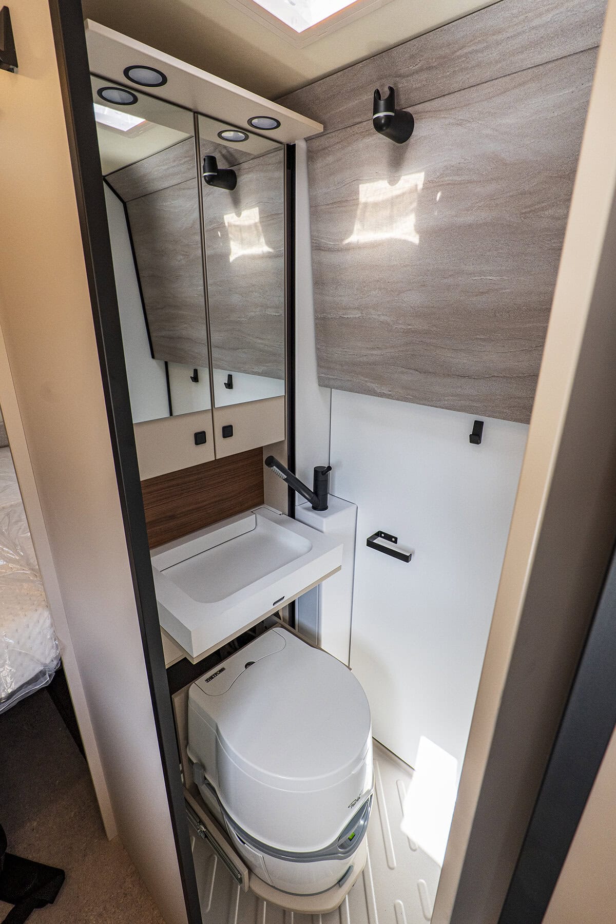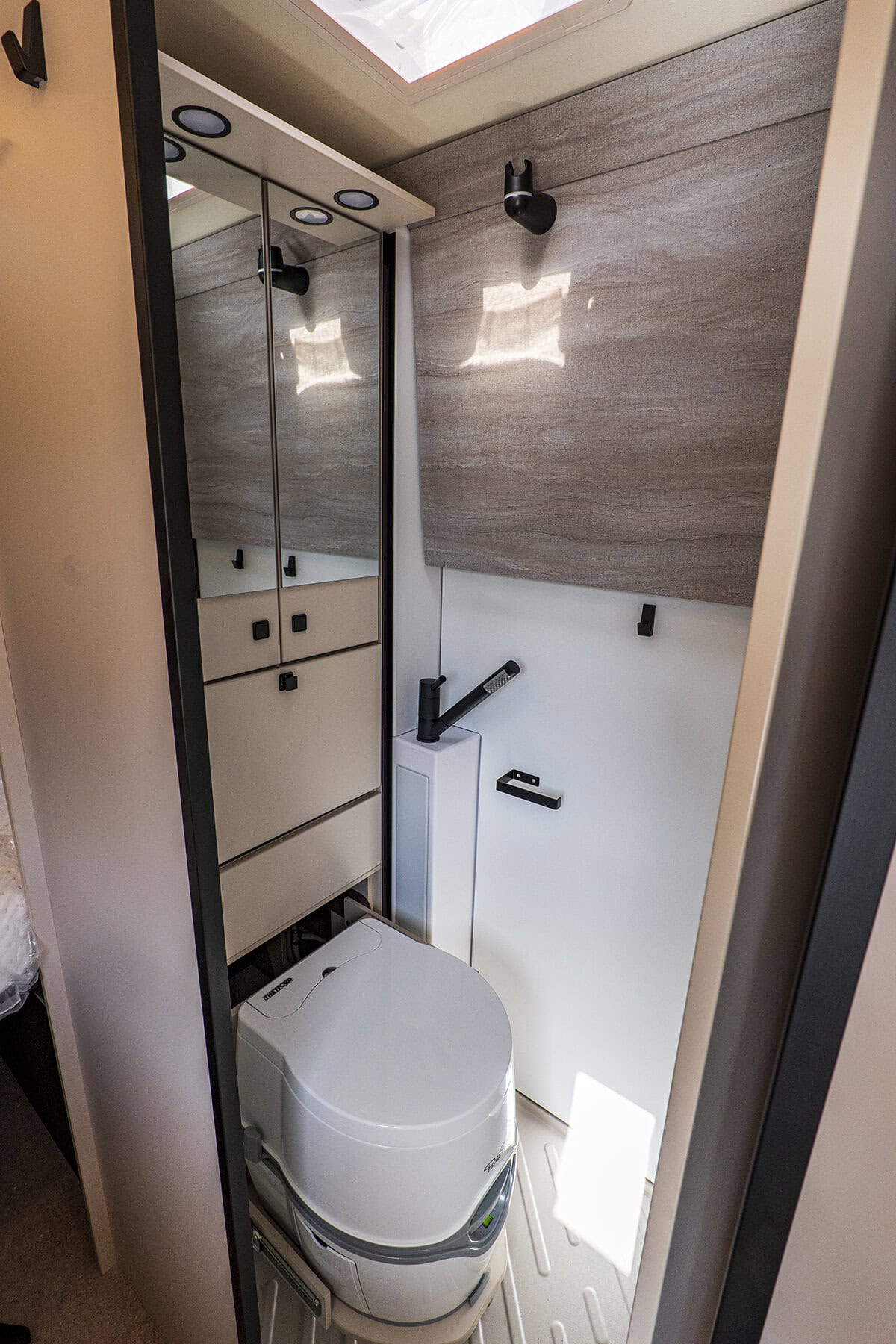Badrummet är en duschkabin med utfällbart handfat och en Porta-Potti som kan dras fram ur sitt gömsle vid behov. Jag har inga problem med Porta-Potti. Brukar dock avstå att fylla spolvattentanken, toans övre halva. Istället spolar jag med bilens duschhandtag. På så vis är den övre halvan fjäderlätt när jag ska ta av den för att gå och tömma den undre halvan.