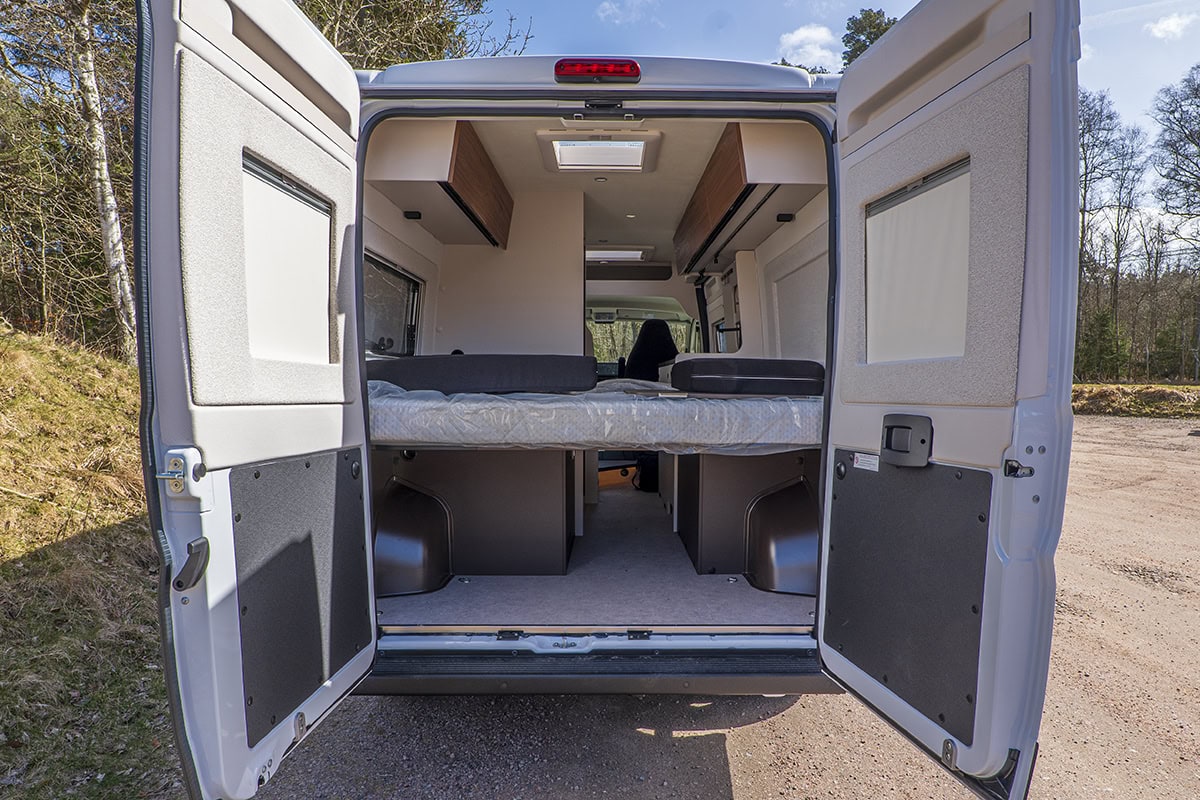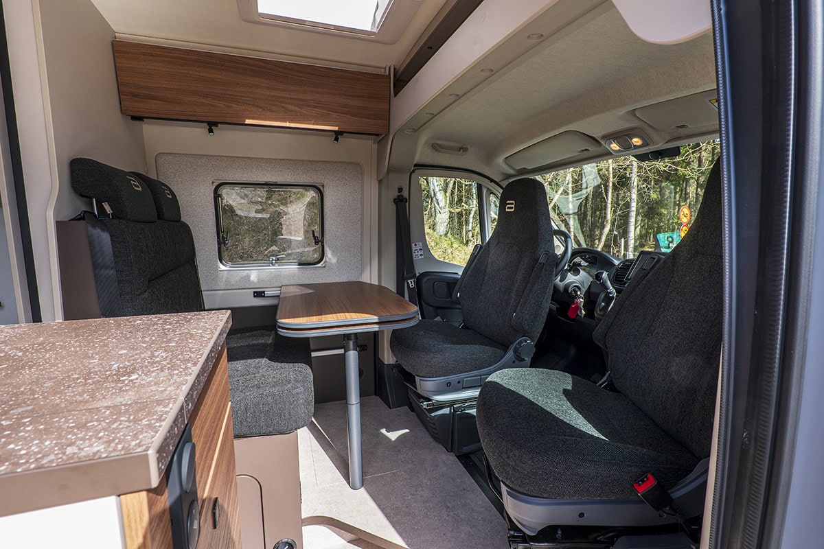 Bilen är sex meter och inredd som de flesta sexmeters plåtisar. Tvärbädd bak, kök och badrum midskepps, en sittgrupp fram med snurrbara framstolar. Gott så.