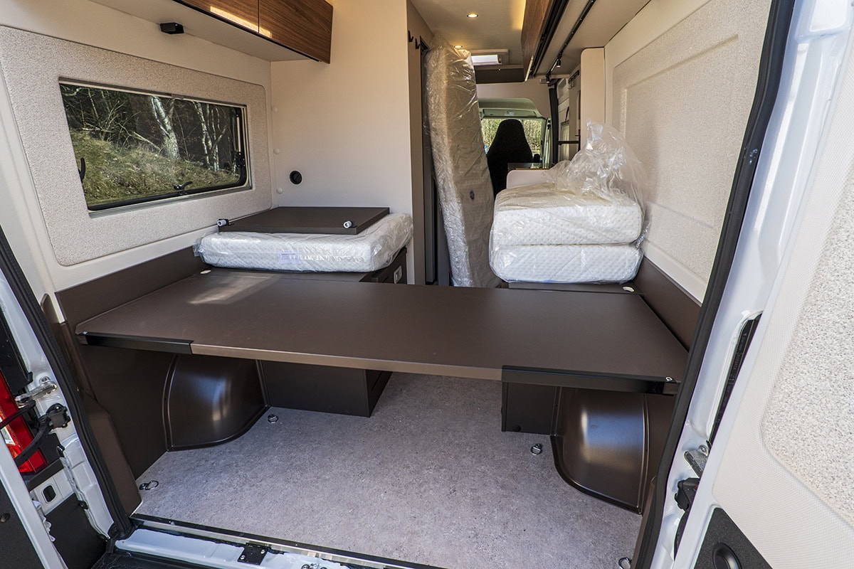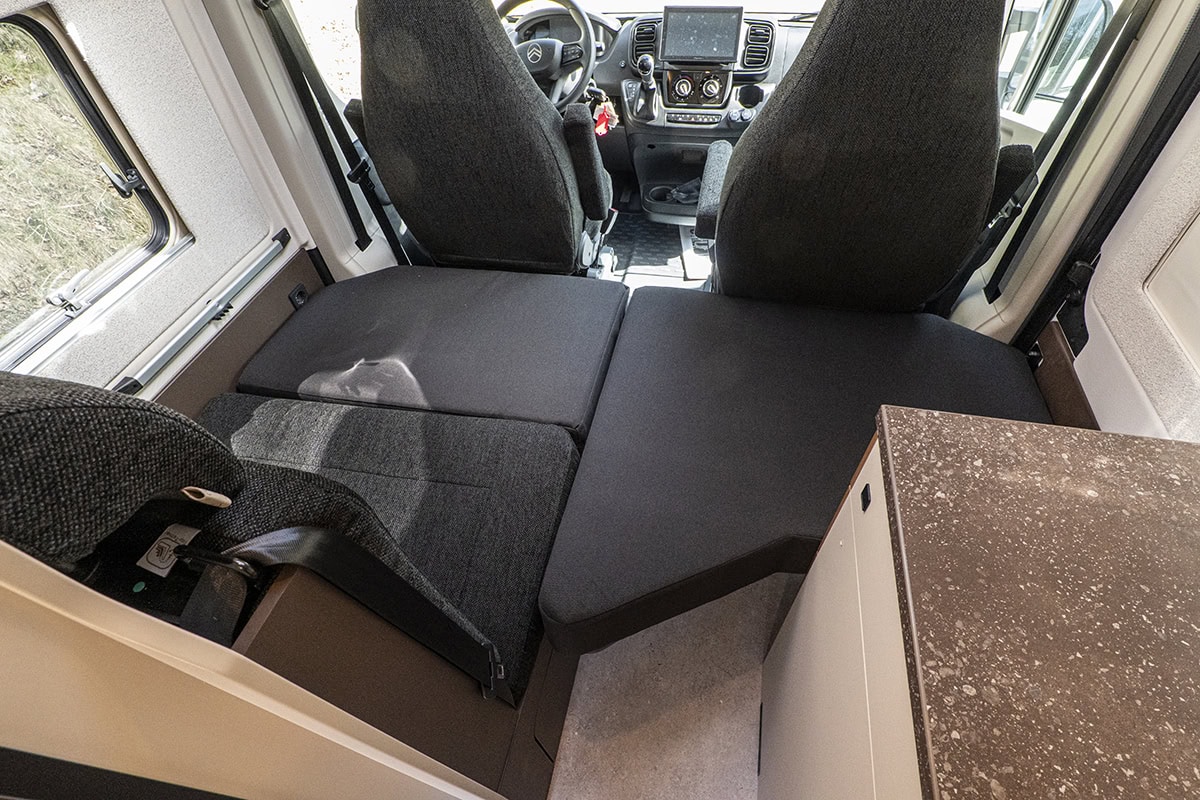 Sittgruppen är inte mycket att orda om. Annat än att det är en generöst tjock dyna i soffan. Det finns en bäddsats som förvandlar sittgruppen till en bra säng. Tyvärr får denna bäddsats inte plats i garaget. Blir att förvara skiva och extra madrass på sängen. Inte en idealisk lösning att ha en tung skiva liggandes lös under färd.