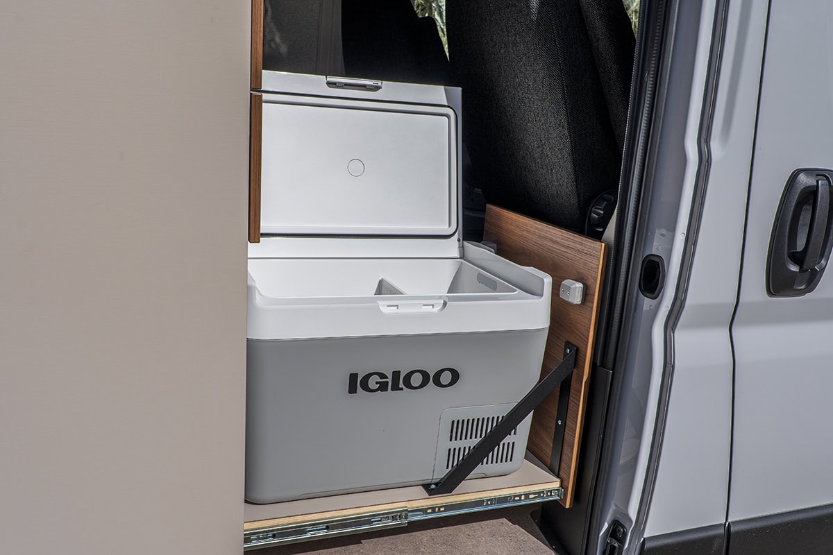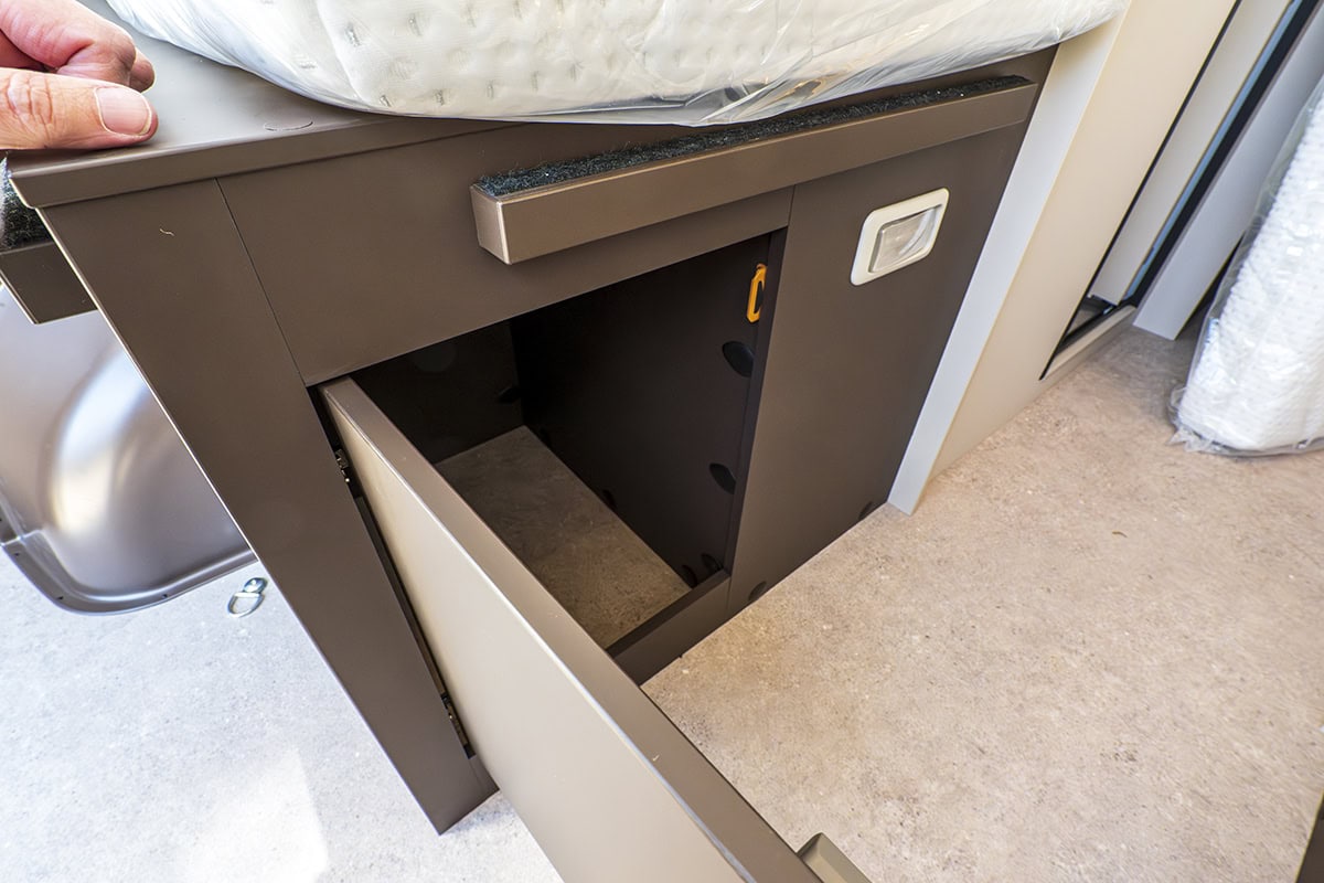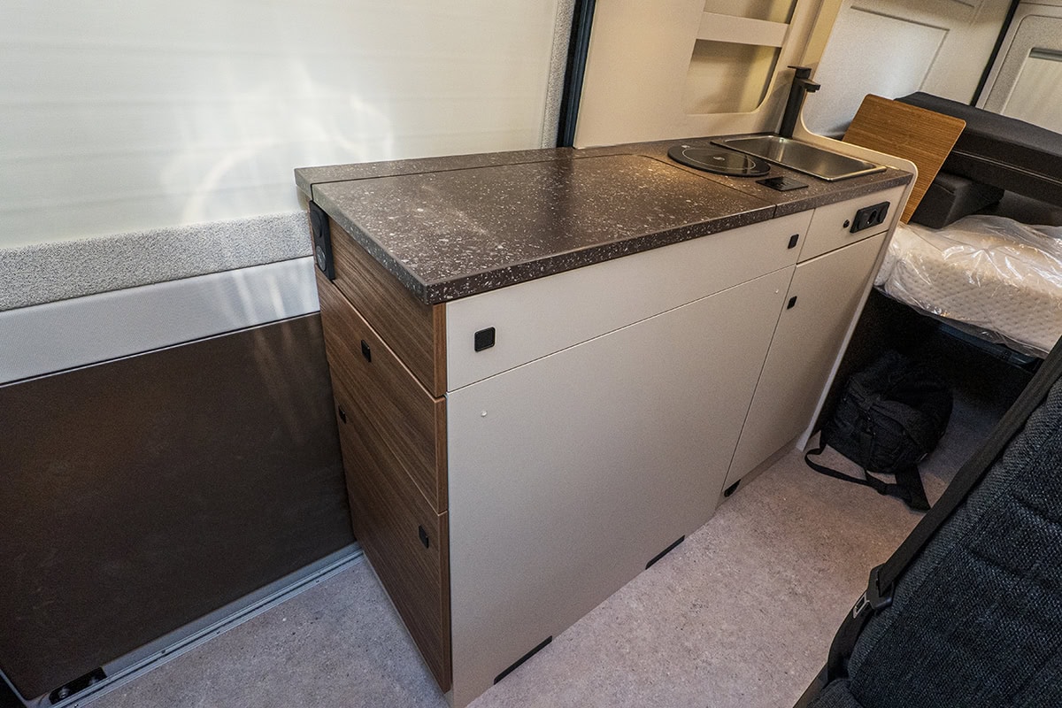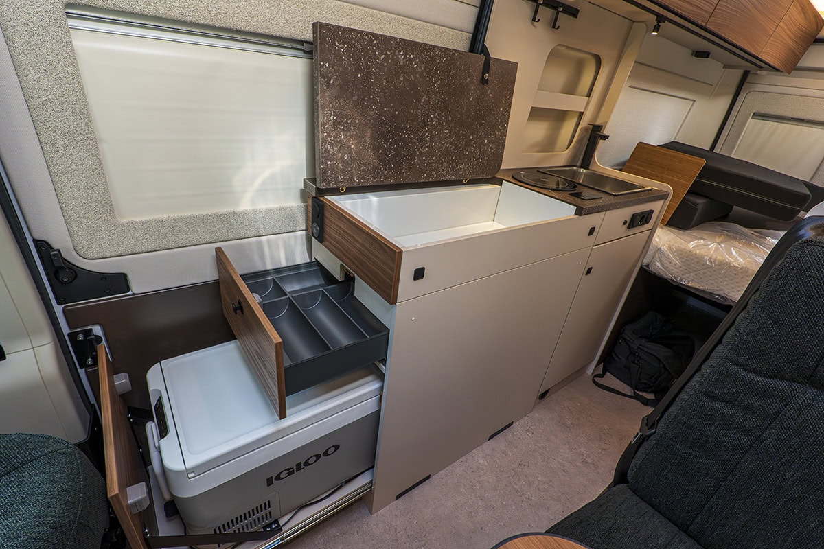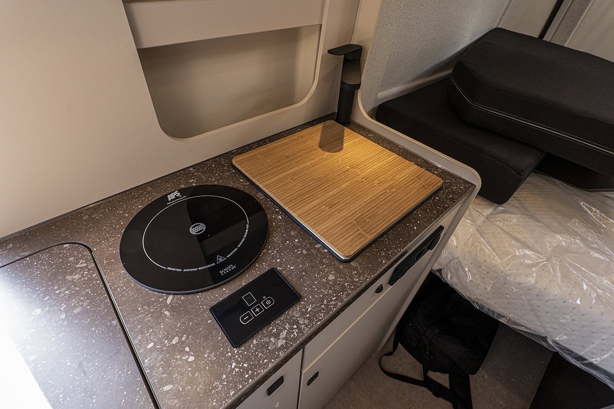 Den har ramfönster, väggarna är textilklädda, värmaren är Trumas största dieselpanna på 6 kW. En induktionsplatta ståtar på köksbänken. En rejält tilltagen köksbänk dessutom. I änden av köket huserar en mobil kompressorkylbox i en låda. Jag tycker kylboxar är bättre än kylskåp, helt enkelt för att de håller kylan bättre.