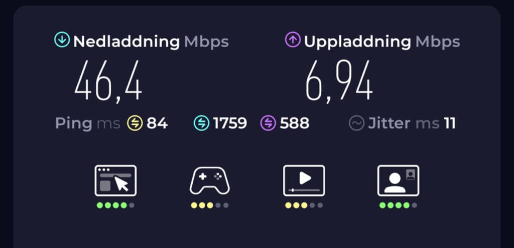 Endast dÄ jag upplevde att internet var lÄngsamt startade jag om routern. Vilket var tvÄ gÄnger under de knappa tre veckor jag var ute. Efter omstart var farten tillfyllest igen.