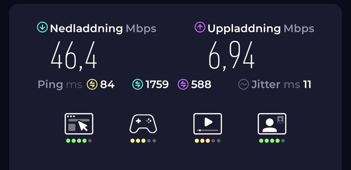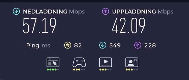 Uppladdning Àr alltid lÄngsammare Àn nedladdning. PÄ routern typ 10-15% lÄngsammare. I telefonen Àr skillnaden betydligt större, dÀr ligger uppladdningen pÄ ca 10-15% av nedladdningshastigheten. För mig Àr den högre uppladdningshastigheten guld vÀrd. För allt jag publicerar laddas upp. Hade jag laddat upp en 9GB video till YouTube med telefonen hade det tagit timmar. Med routern minst tio gÄnger fortare.